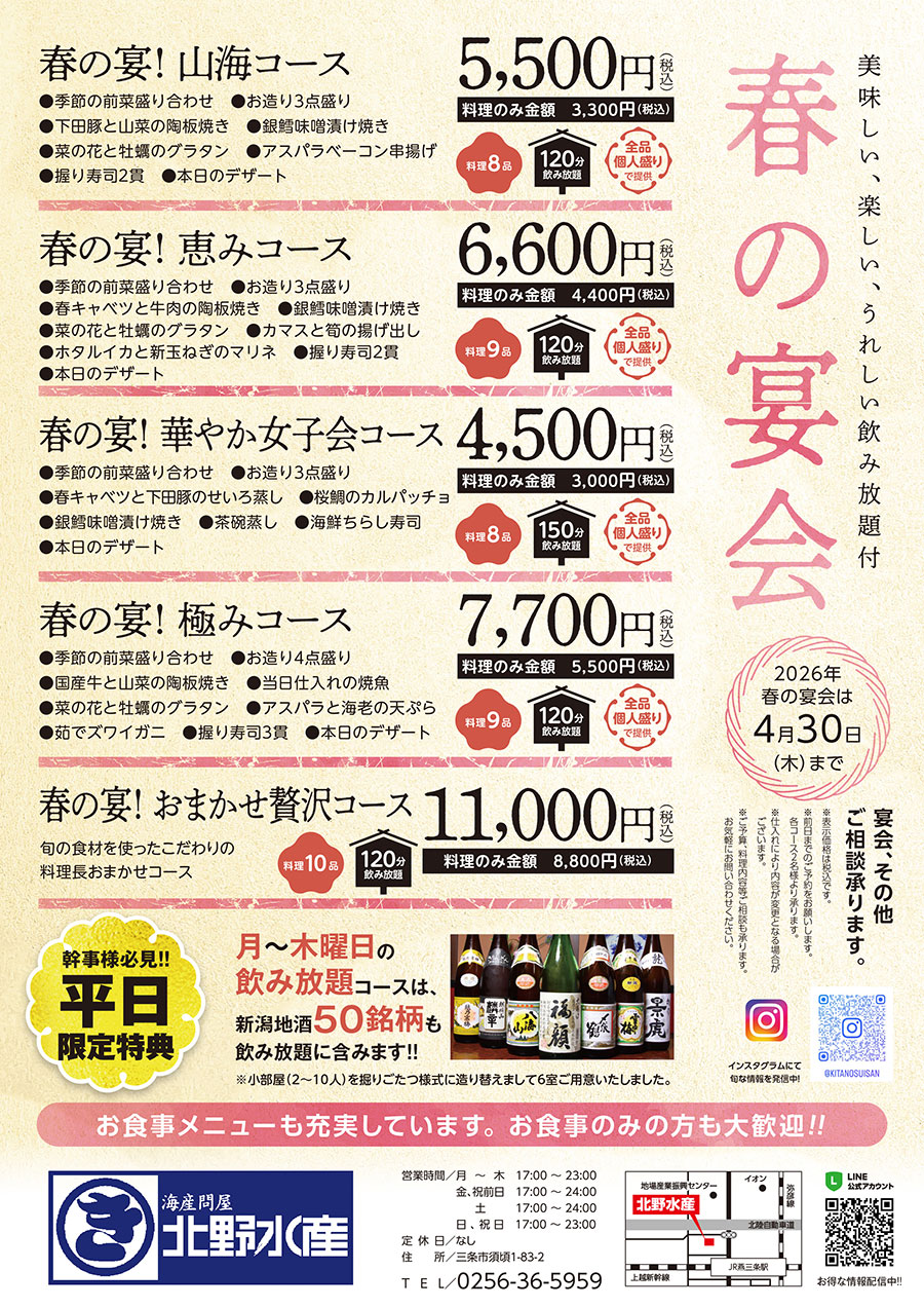 北野水産 春の宴会コース始まりました。